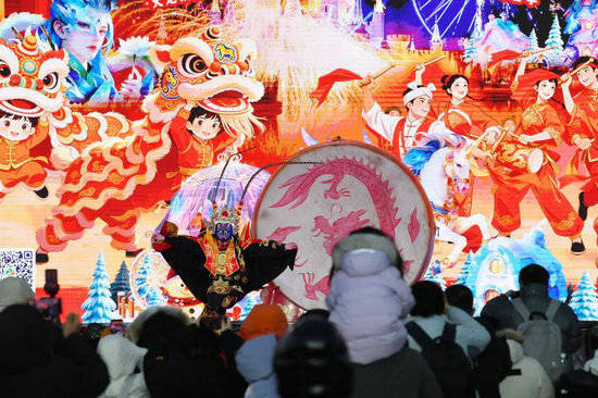 春节活动集非遗表演、光影艺术、特色美食、趣味互动于一体。文艺演出板块包含四大主题,全天将有21场精彩节目轮番上演:既有气势恢宏的非遗安塞腰鼓、年味浓郁的舞龙舞狮、绚丽夺目的“火龙钢花”;也有“时空穿越”主题花车与鱼灯巡游巧妙融合国潮风尚与非遗韵味,摩天轮舞台还将持续献上中西荟萃的歌舞表演,更有全民参与的“新春蹦迪”环节点燃欢乐气氛。